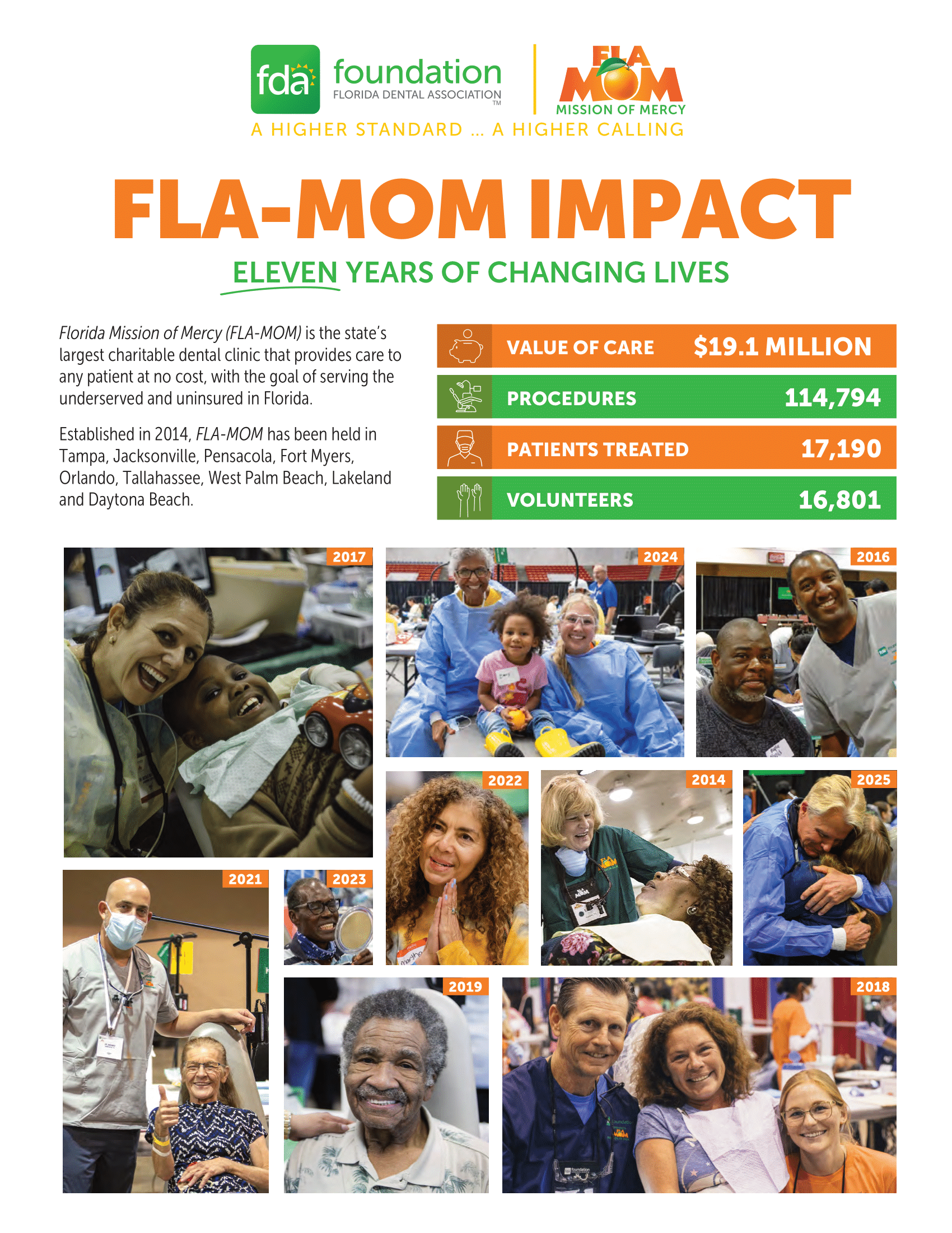 Florida Mission of Mercy (FLA-MOM) is the state's largest dental clinic that provides dental care to any patient at no cost to them, with the goal of serving the under-served and uninsured in Florida - those who would otherwise go without care.